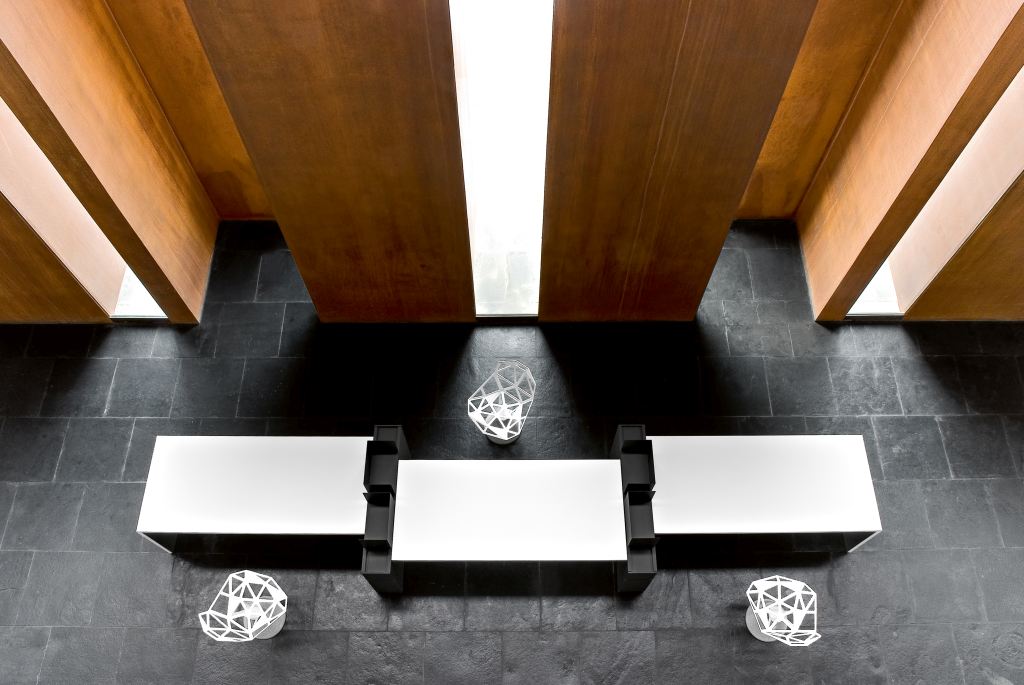 Apoyos e intersecciones crean un puesto de recepción limpio y volumétrico.