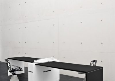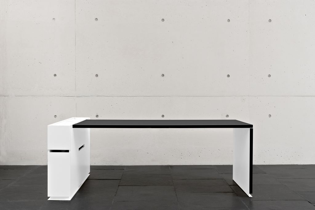 Basada en la pura arquitectura de sus formas, la serie KU combina la ligereza que presentan sus voladuras, sus intersecciones y sus nuevos materiales, con la solidez de su pata-bloque, elemento del que nace el sobre de trabajo y en el que se ubican todos los mecanismos eléctricos bajo un sencillo sistema de tapas desplazables donde fijar una serie de accesorios y complementos. En definitiva, un paso hacia el futuro tecnológico con una imagen limpia y constructiva.